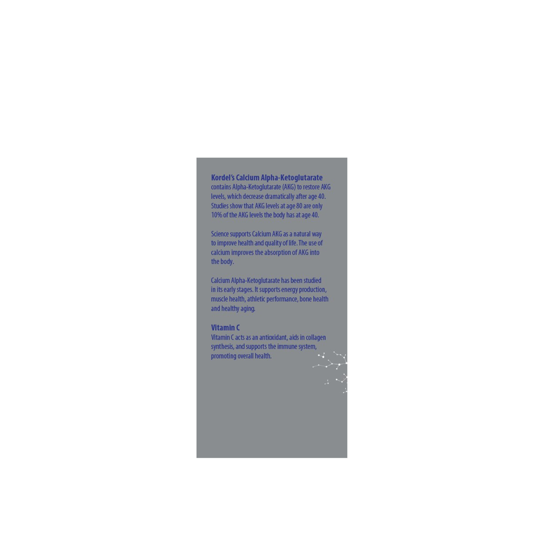 Contains Alpha-Ketoglutarate (AKG) to restore AKG levels, which decrease dramatically after age 40. Studies show that AKG levels at age 80 are only 10% of the AKG levels the body has at age 40. Science supports Calcium AKG as a natural way to improve health and quality of life. The use of calcium improves the absorption of AKG into the body.Calcium Alpha-Ketoglutarate has been studied in its early stages.
